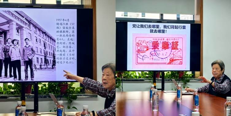 活动在有序的流程中展开。访谈伊始,胡奈赛教授以一张1956年印有“向科学进军,建设大西北”的乘车证为引,结合珍贵的老照片,深情回顾了自己作为第一批西迁教师于1957年从上海来到西安的经历。她讲述了与龚剑耀、陈婉艺、洪起超等同事一同投身西部教育建设的往事,展现了老一辈交大人响应国家号召、扎根西北的坚定决心。支部成员李雨涵在聆听后表示:“胡教授的讲述让我深刻体会到,西迁精神就蕴含在老教授们一丝不苟的治学态度中,体现在校园一草一木的精心呵护里。”