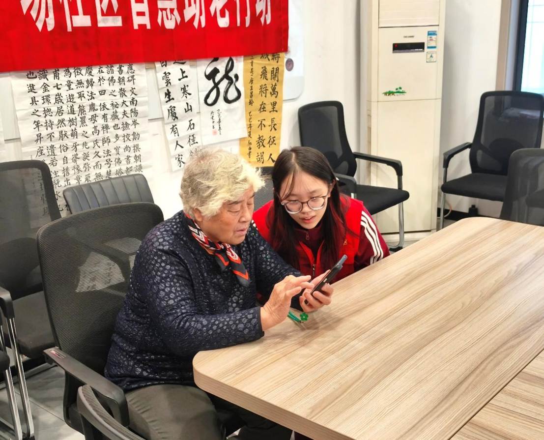在社区会议室内,志愿者们还开展了“菜鸟学堂”智慧助老活动,细致地教老人们如何使用智能手机的基本功能,如拨打电话、查看短信、使用微信等。老人们学习认真,不时提出问题,同学们一一解答,现场气氛温馨融洽。